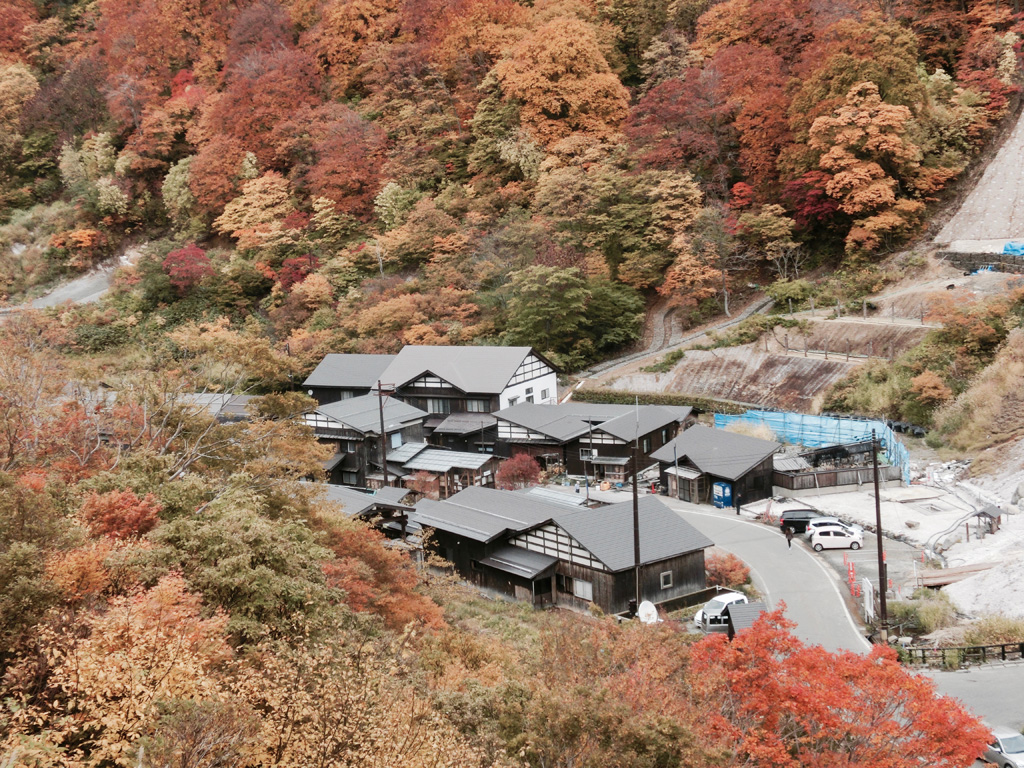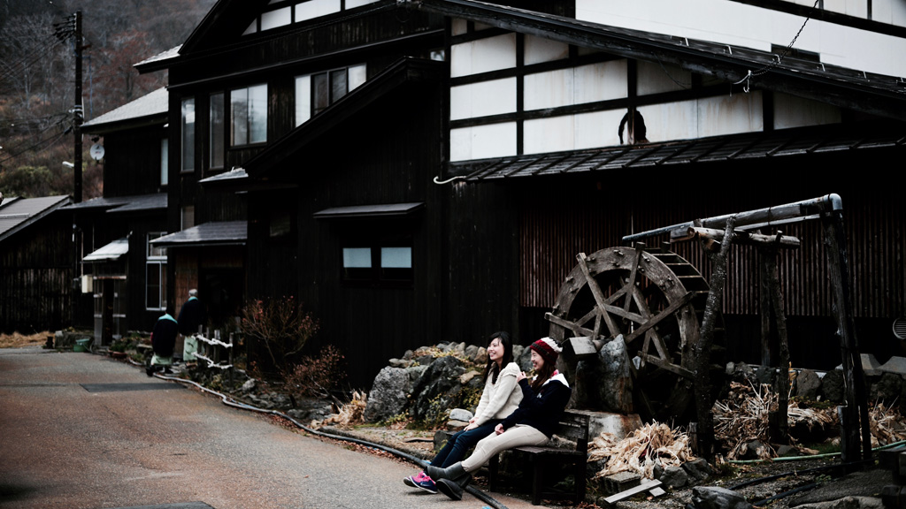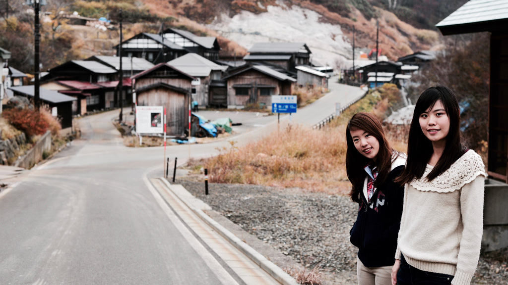 翻閱過危險的山路,出現了一個小村莊。很隱匿而帶著神秘色彩,像以前的日本電影一般,每一家形狀顏色幾乎都差不多,滿溢著難以言表的人煙稀少的安寧感。特別是這裡一排的溫泉屋,真的是有趣又古色古香。