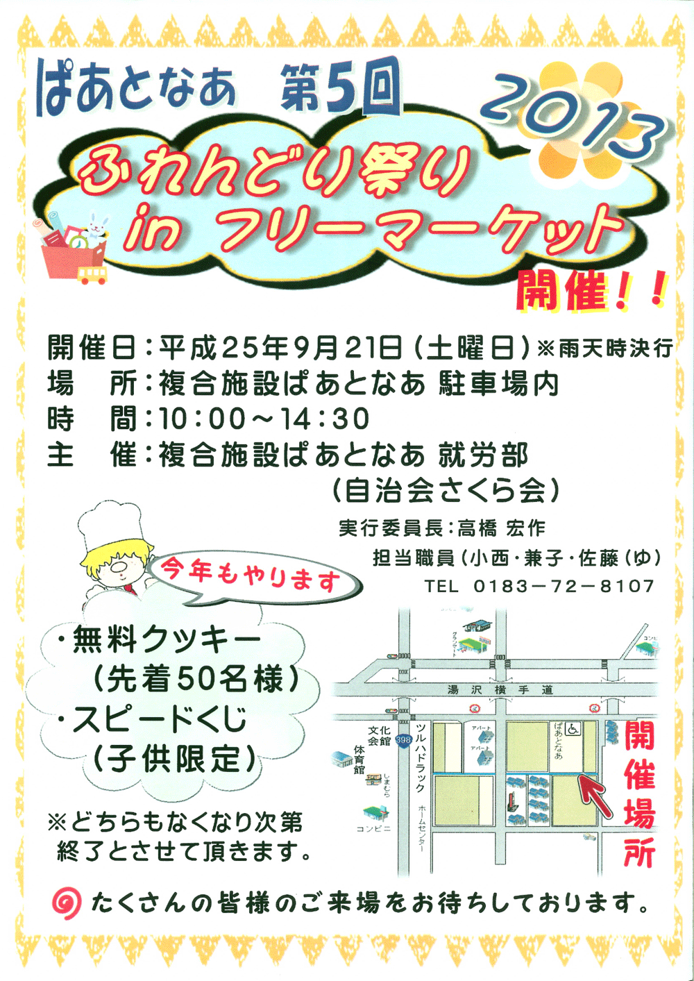 ‚Ó‚ê‚ ‚¢ƒtƒFƒXƒ^@‘æ‚P‚R‰ñƒtƒŠ[ƒ}[ƒPƒbƒg in ¼•— @‰ïêFáŠQŽÒ‘‡Žx‰‡Ž–‹ÆŠu¼•—vŽ{Ý‘OLê @ŽžŠÔF10F00`14F00 @“üê—¿F–³—¿ @–â‚¢‡‚킹F0183-78-0066 |