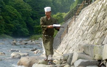 「まこ食堂」はどこへでも出前可能です。川原の湯っこを楽しみながらお腹も満たせます。